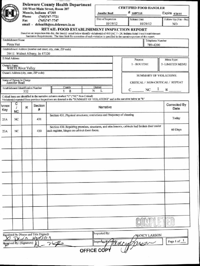 Delaware County Health Department 100 West Main Street, Room 207 Muncie, Indiana 47305 Phone (765)7477721 Fax (765)7477747 email dchealth@co.delaware.in.usCERTIFIED FOOD HANDLER Jennifer BeallDate