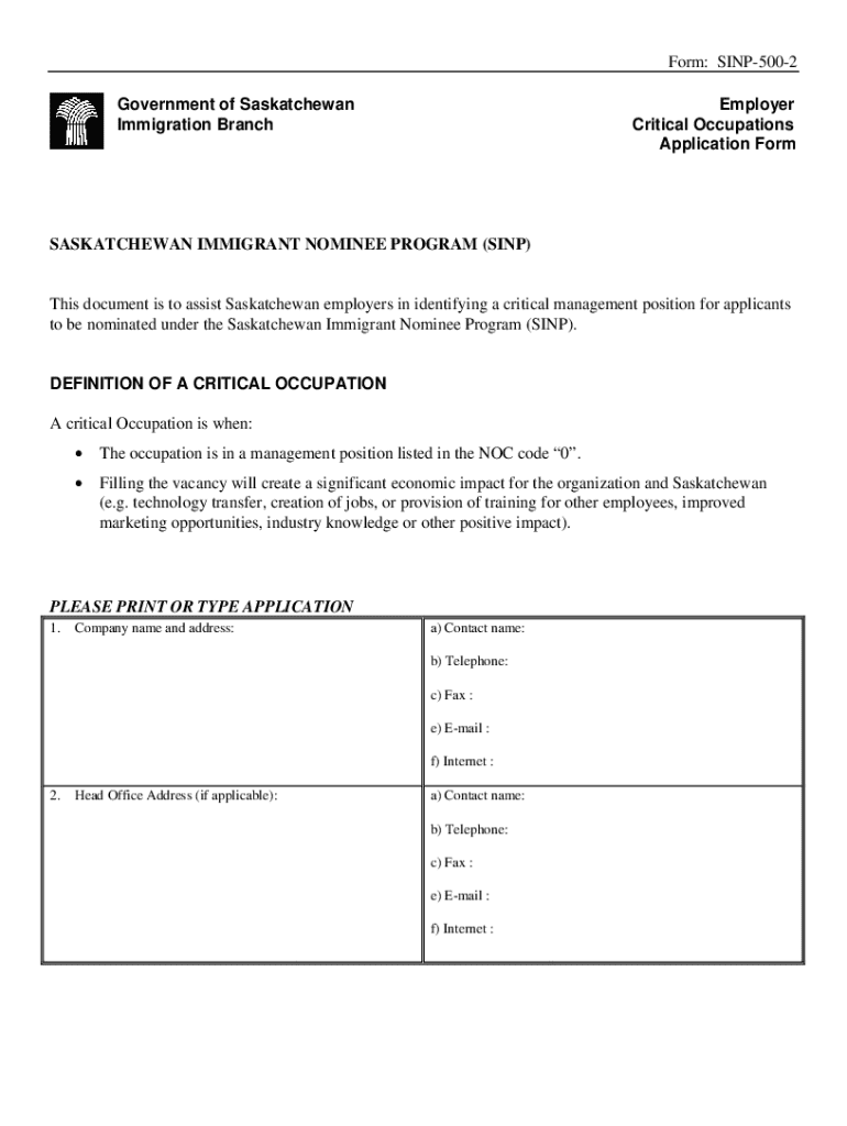 This application form assists Saskatchewan employers in identifying critical management positions for applicants to be nominated under the Saskatchewan Immigrant Nominee Program (SINP). It outlines the requirements and criteria for critical occupations and the economic impact these positions can have on the organization and the province.