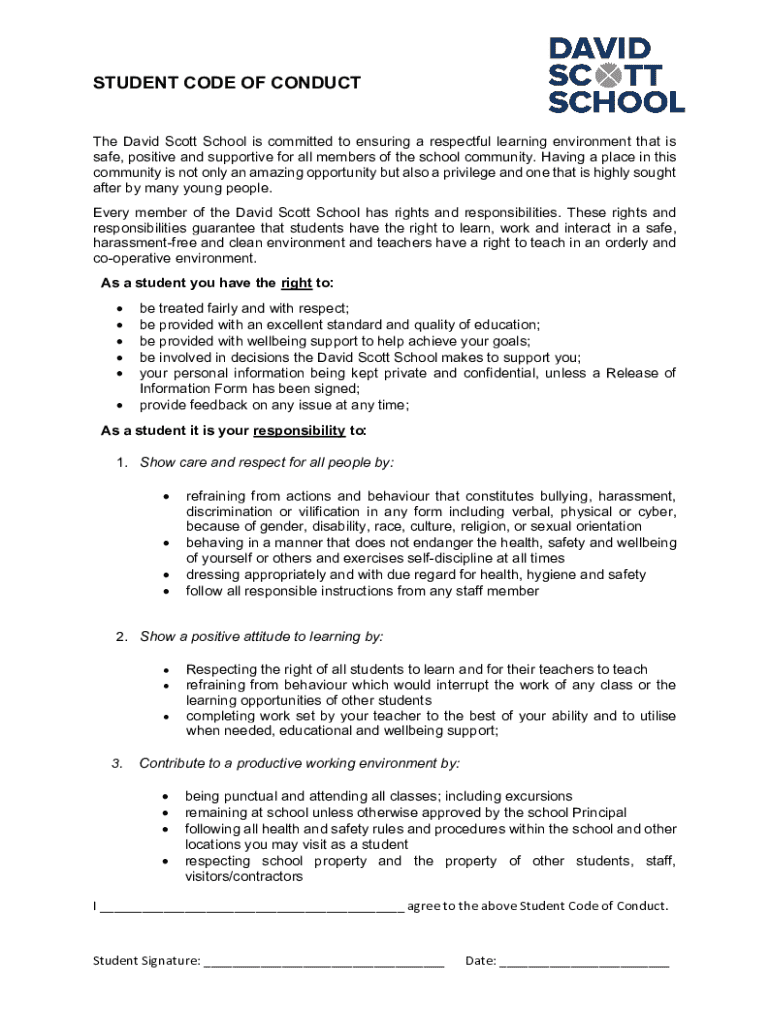 STUDENT CODE OF CONDUCT The David Scott School is committed to ensuring a respectful learning environment that is safe, positive and supportive for all members of the school community. Having a place