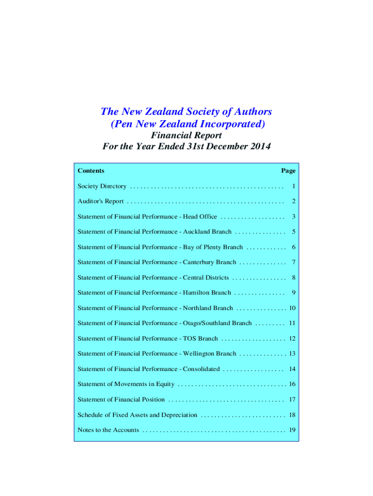 The New Zealand Society of Authors (Pen New Zealand Incorporated) Financial Report For the Year Ended 31st December 2014 ContentsPageSociety Directory . . . . . . . . . . . . . . . . . . . . . . .