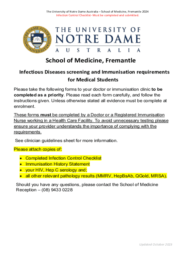 The University of Notre Dame Australia School of Medicine, Fremantle 2024 Infection Control Checklist Must be completed and submitted.School of Medicine, Fremantle Infectious Diseases screening and