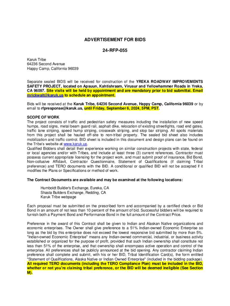 ADVERTISEMENT FOR BIDS 24RFP055 Karuk Tribe 64236 Second Avenue Happy Camp, California 96039Separate sealed BIDS will be received for construction of the YREKA ROADWAY IMPROVEMENTS SAFETY PROJECT,