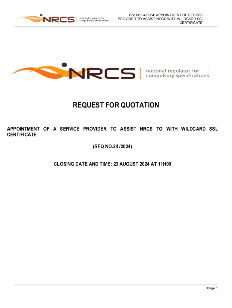 Doc No.24/2024: APPOINTMENT OF SERVICE PROVIDER TO ASSIST NRCS WITH WILDCARD SSL CERTIFICATE.REQUEST FOR QUOTATION APPOINTMENT OF A SERVICE PROVIDER TO ASSIST NRCS TO WITH WILDCARD SSL CERTIFICATE.