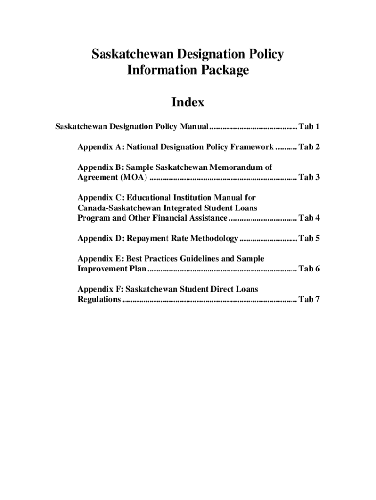 Saskatchewan Designation Policy Information Package Index Saskatchewan Designation Policy Manual ......................................... Tab 1 Appendix A: National Designation Policy Framework ..........