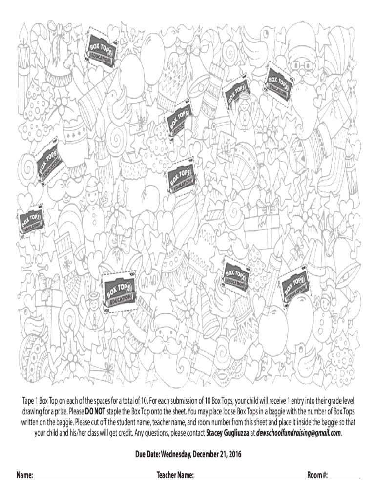 Tape 1 Box Top on each of the spaces for a total of 10. For each submission of 10 Box Tops, your child will receive 1 entry into their grade level drawing for a prize. Please DO NOT staple the Box