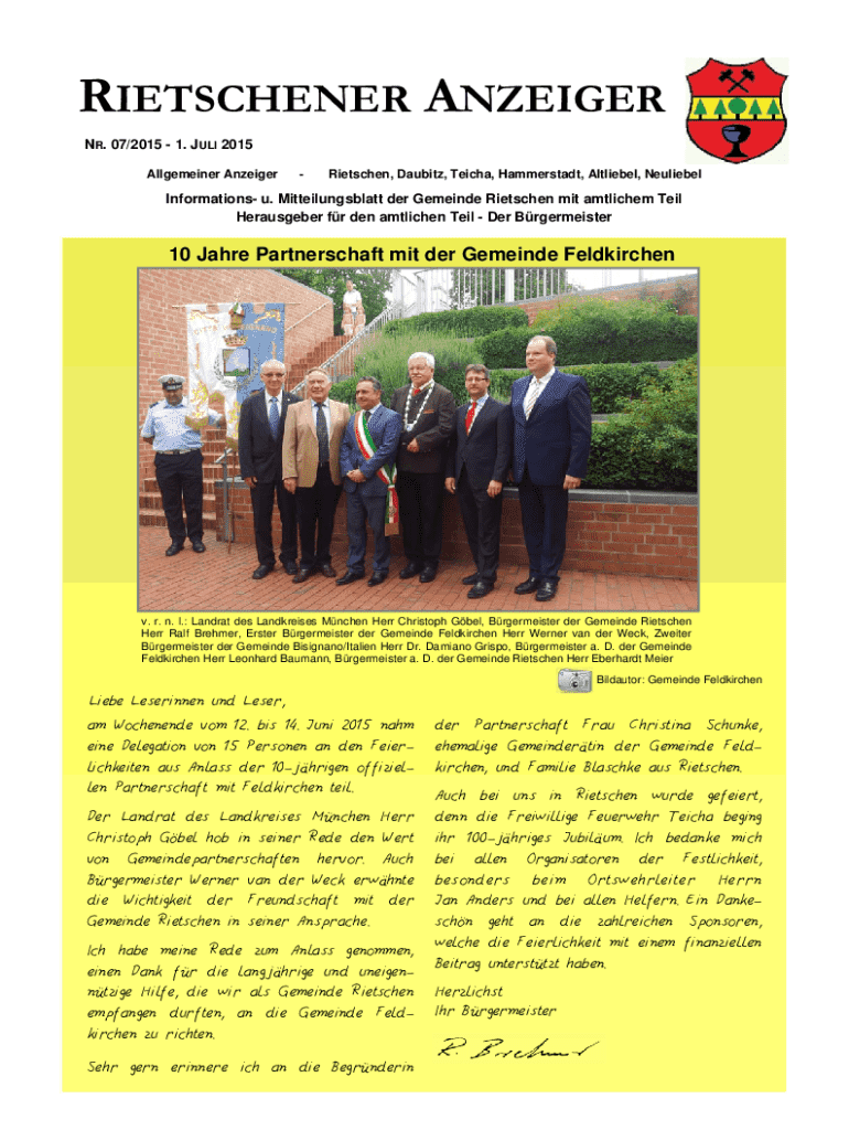 RIETSCHENER ANZEIGER NR. 07/2015 1. JULI 2015 Allgemeiner AnzeigerRietschen, Daubitz, Teicha, Hammerstadt, Altliebel, NeuliebelInformations u. Mitteilungsblatt der Gemeinde Rietschen mit amtlichem