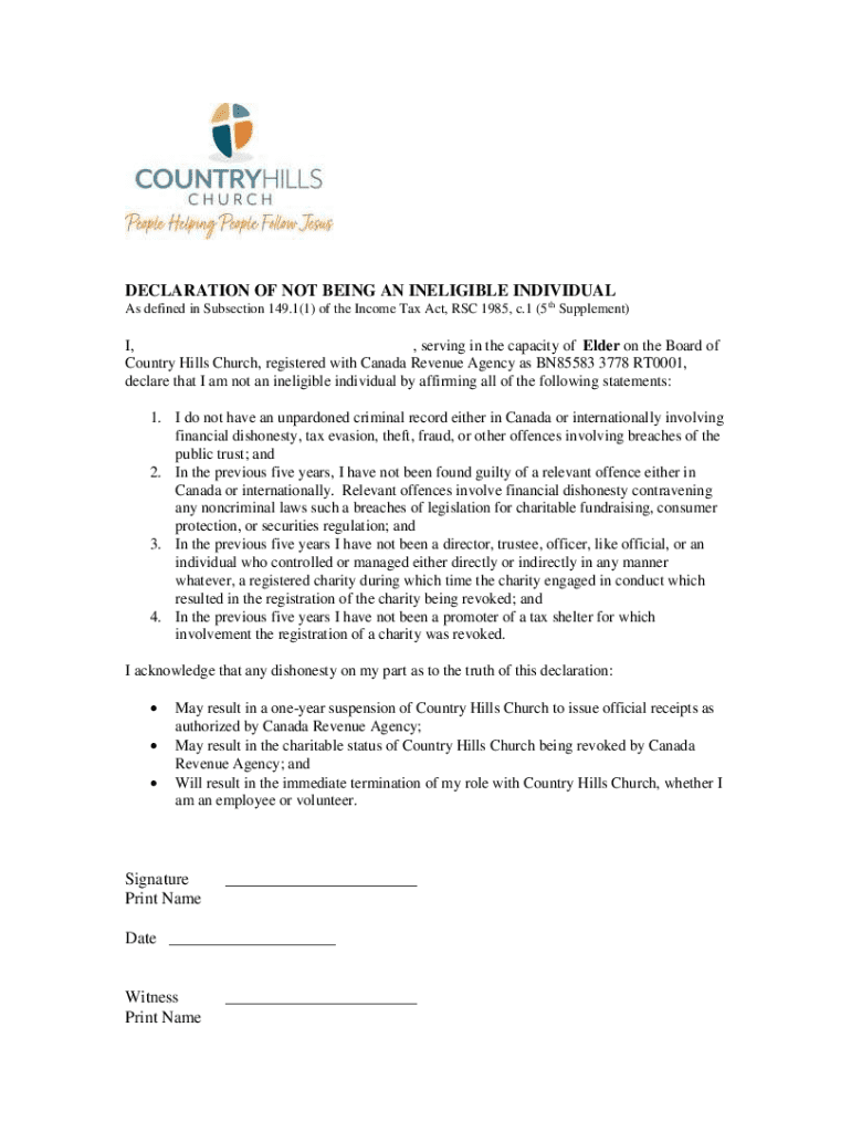 This document serves as a declaration for individuals asserting their eligibility to serve on the Board of Country Hills Church, affirming they do not have any criminal records or involvement in activities that could jeopardize the church\'s charitable status.