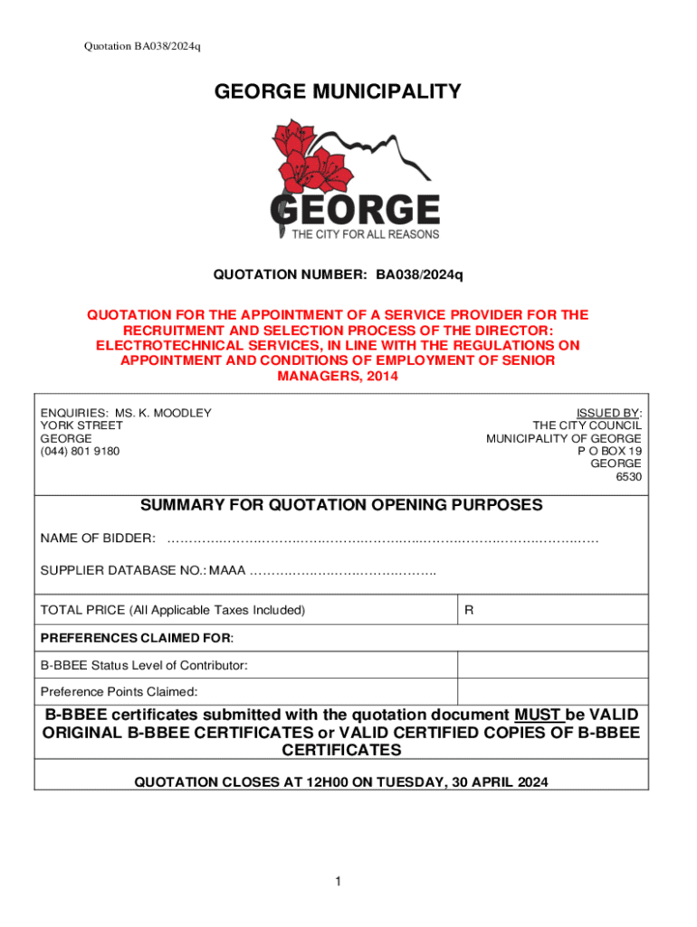 This document is a formal request for quotations from service providers for conducting the recruitment and selection process for the Director of Electrotechnical Services in the George Municipality, adhering to the 2014 regulations on the appointment and conditions of senior managers. It outlines the requirements for submission, evaluation criteria, and key contact information.