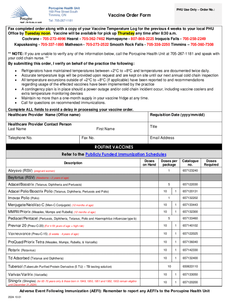 This document is a Vaccine Order Form used by healthcare providers to request vaccines from the Porcupine Health Unit. It includes sections for provider information, vaccine requests, and adherence to temperature monitoring and cold chain management requirements. Providers must complete all fields to avoid delays and report any adverse events following immunizations.