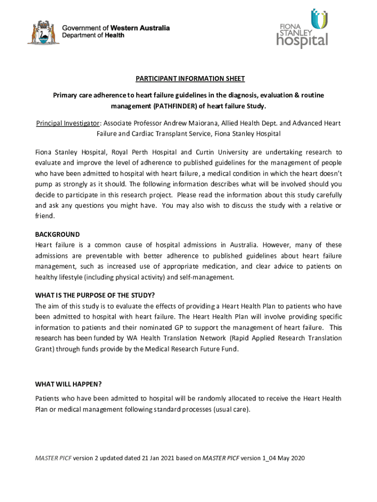 PARTICIPANT INFORMATION SHEET Primary care adherence to heart failure guidelines in the diagnosis, evaluation & routine management (PATHFINDER) of heart failure Study. Principal Investigator: Associate