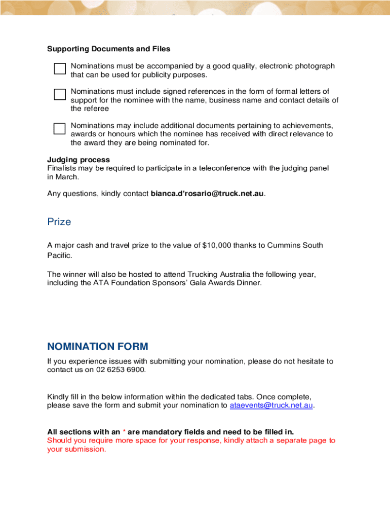 National Trucking Industry Woman of the Year Conditions of Entry In submitting this nomination, the person making the nomination affirms they have complied with the following conditions of entry: