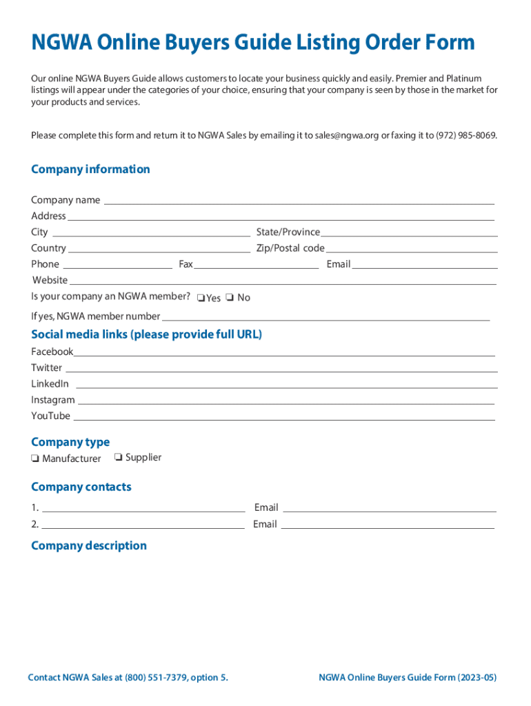 NGWA Online Buyers Guide Listing Order Form Our online NGWA Buyers Guide allows customers to locate your business quickly and easily. Premier and Platinum listings will appear under the categories