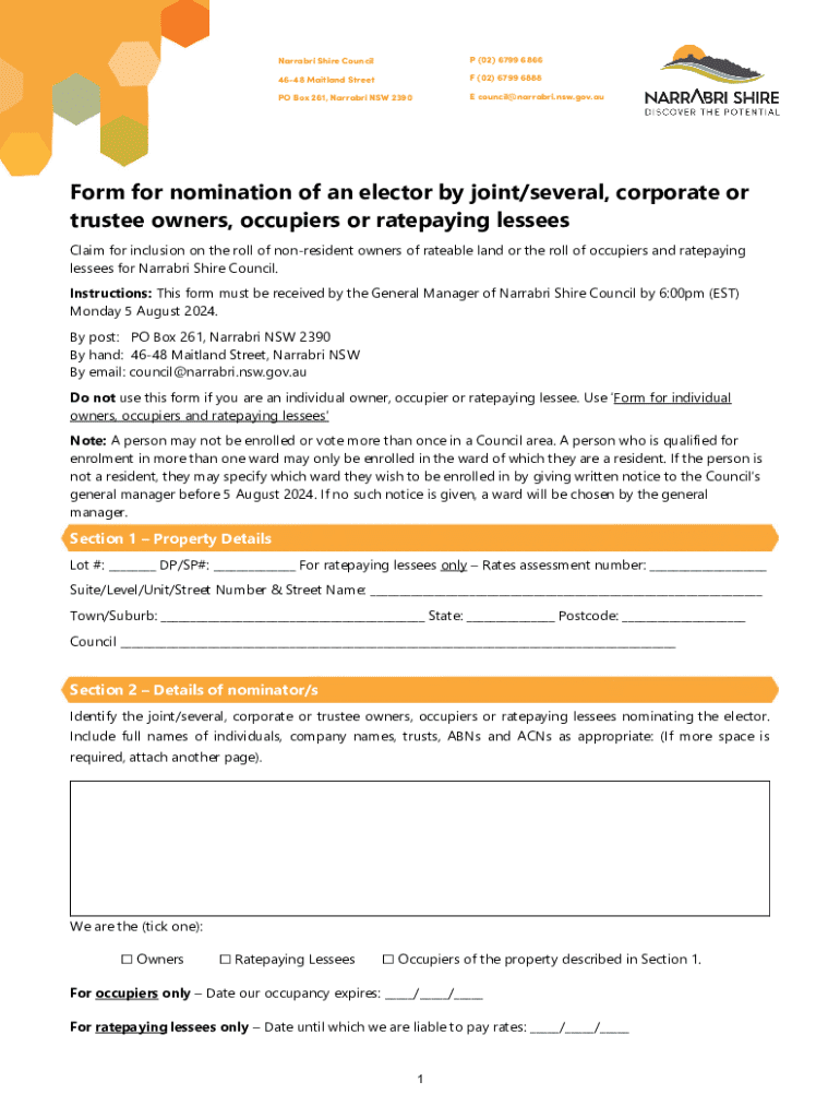 This form is intended for the nomination of an elector by joint/several, corporate or trustee owners, occupiers, or ratepaying lessees for the Narrabri Shire Council. It is used to claim inclusion on the electoral roll for non-resident owners of rateable land or for occupiers and ratepaying lessees. The completed form must be submitted by a specified deadline to be considered for enrollment.