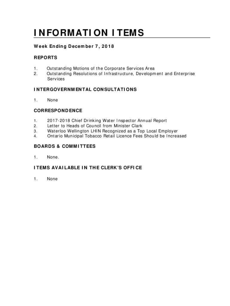 INFORMATION ITEMS Week Ending December 7, 2018 REPORTS 1. 2.Outstanding Motions of the Corporate Services Area Outstanding Resolutions of Infrastructure, Development and Enterprise ServicesINTERGOVERNMENTAL
