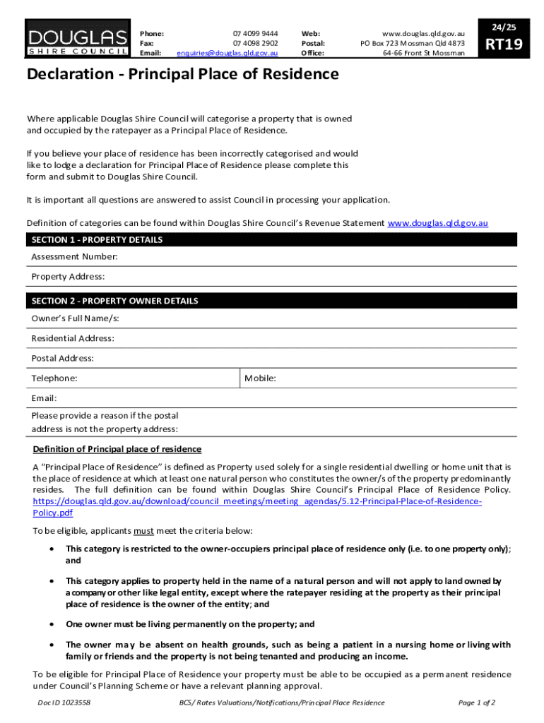 This form is used to declare a property owned and occupied by the ratepayer as a Principal Place of Residence for the purpose of categorizing the property by the Douglas Shire Council. It requires completion of property and owner details, along with the submission of supporting documentation to prove residency.