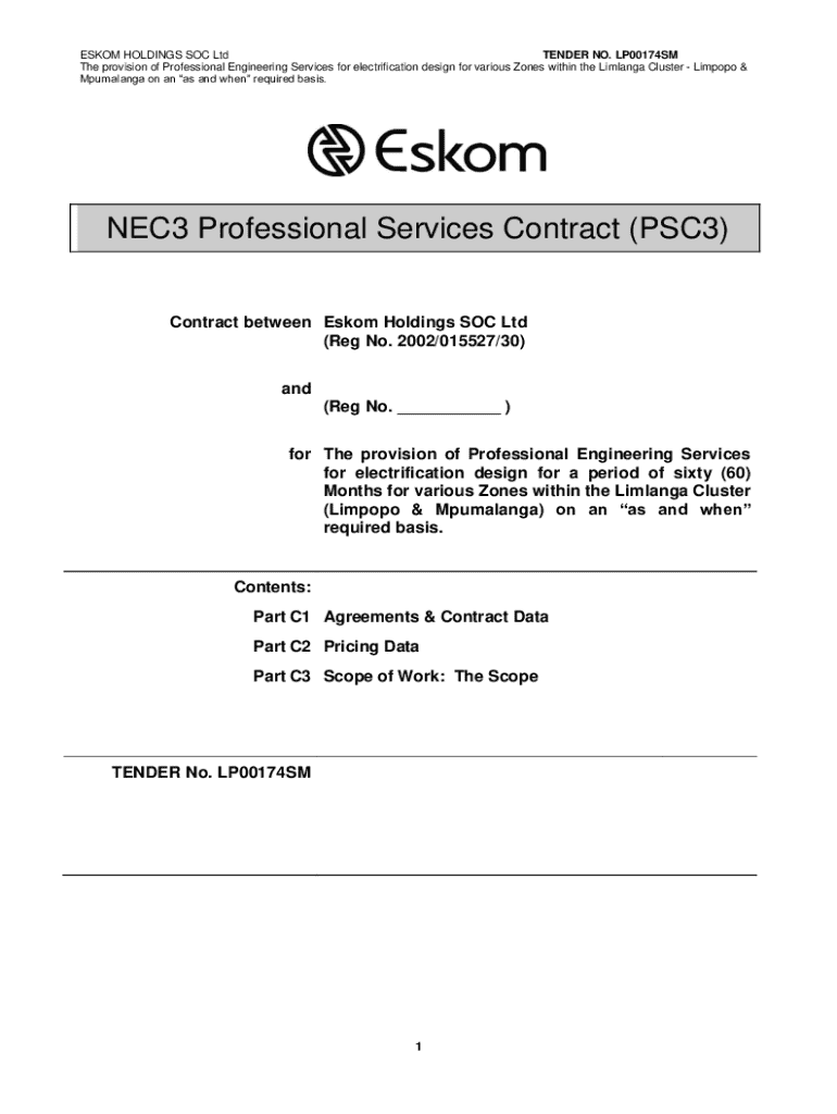 This document outlines the tender process and contract details for the provision of professional engineering services, specifically focused on electrification design for various zones within the Limlanga Cluster located in Limpopo and Mpumalanga. The services are to be provided on an \'as and when\' required basis, with a contractual period of sixty months and structured under the NEC3 Professional Services Contract (PSC3). It includes contractual guidelines, pricing data, project scope,...