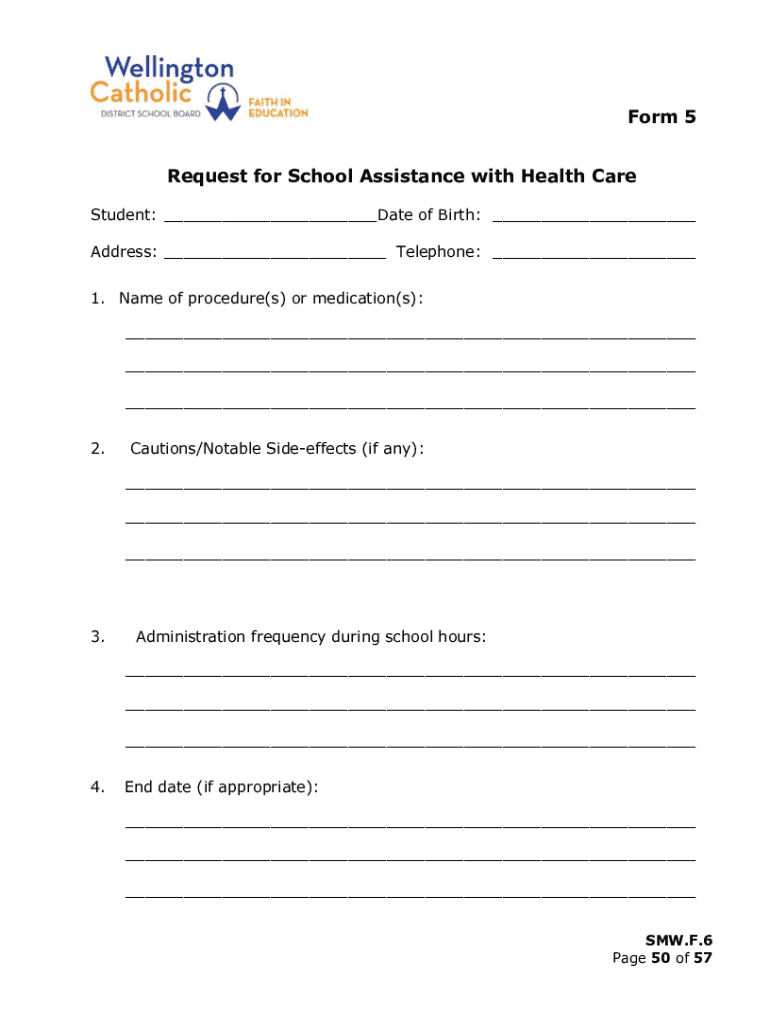 Form 5 Request for School Assistance with Health Care Student: ___ Date of Birth: ___ Address: ___ Telephone: ___ 1. Name of procedure(s) or medication(s): ___ ___ ___ 2.Cautions/Notable Sideeffects