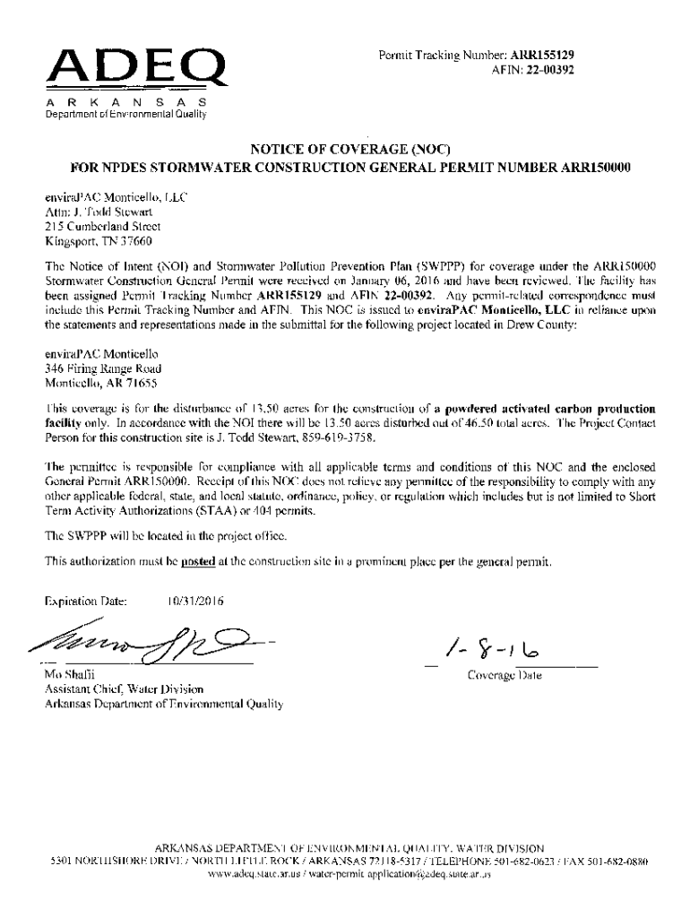 This document serves as a Notice of Coverage (NOC) issued by the Arkansas Department of Environmental Quality for the enviraPAC Monticello, LLC under the NPDES Stormwater Construction General Permit ARR150000. It outlines responsibilities, permit tracking information, site-specific details, and requirements for stormwater management related to the construction of a powdered activated carbon production facility in Drew County, Arkansas. The coverage is valid for soil disturbances of 13.50 acres.
