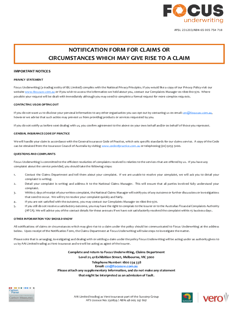 This form is used to notify Focus Underwriting of any claims or circumstances that may give rise to a claim under a professional indemnity insurance policy. It provides details about the insured, the claim, and necessary declaration from the insured party.