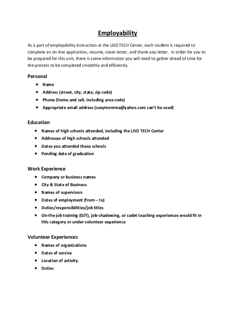 This document outlines the steps and information required for students at the LISD TECH Center to prepare their employability documents, including an online application, resume, cover letter, and thank-you letter. It provides detailed guidance on personal information, education history, work and volunteer experience, awards, certifications, extracurricular activities, and references needed to complete the applications effectively.