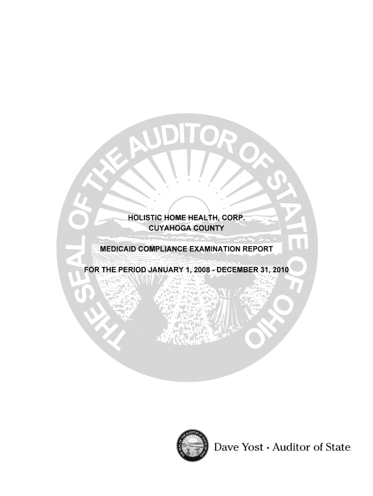 HOLISTIC HOME HEALTH, CORP. CUYAHOGA COUNTY MEDICAID COMPLIANCE EXAMINATION REPORT FOR THE PERIOD JANUARY 1, 2008, DECEMBER 31, 2010, THIS PAGE INTENTIONALLY LEFT BLANK HOLISTIC HOME HEALTH, CORP.