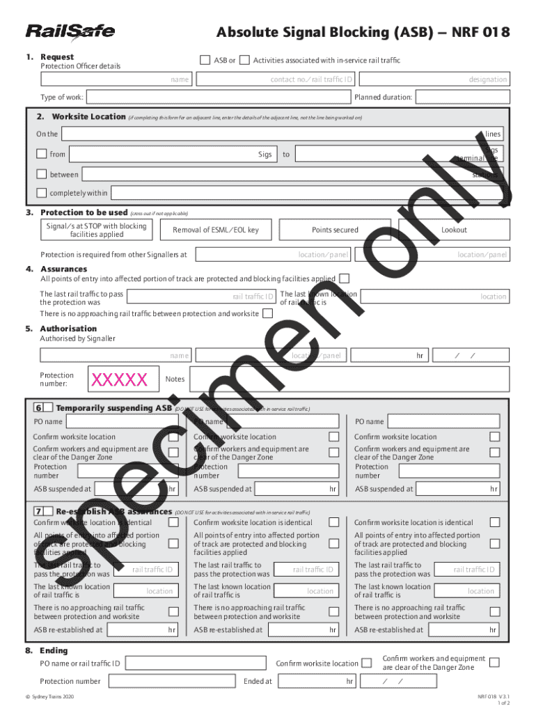 Absolute Signal Blocking (ASB) NRF 018 1. RequestASB orProtection Officer detailsActivities associated with inservice rail trafficnamecontact no./rail traffic IDdesignation Planned duration:Type of