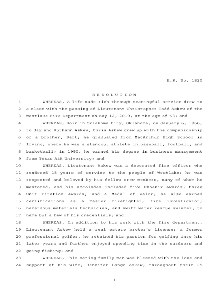 H.R.ANo.A1820R E S O L U T I O N 1WHEREAS, A life made rich through meaningful service drew to2a close with the passing of Lieutenant Christopher Todd Askew of the3Westlake Fire Department on May