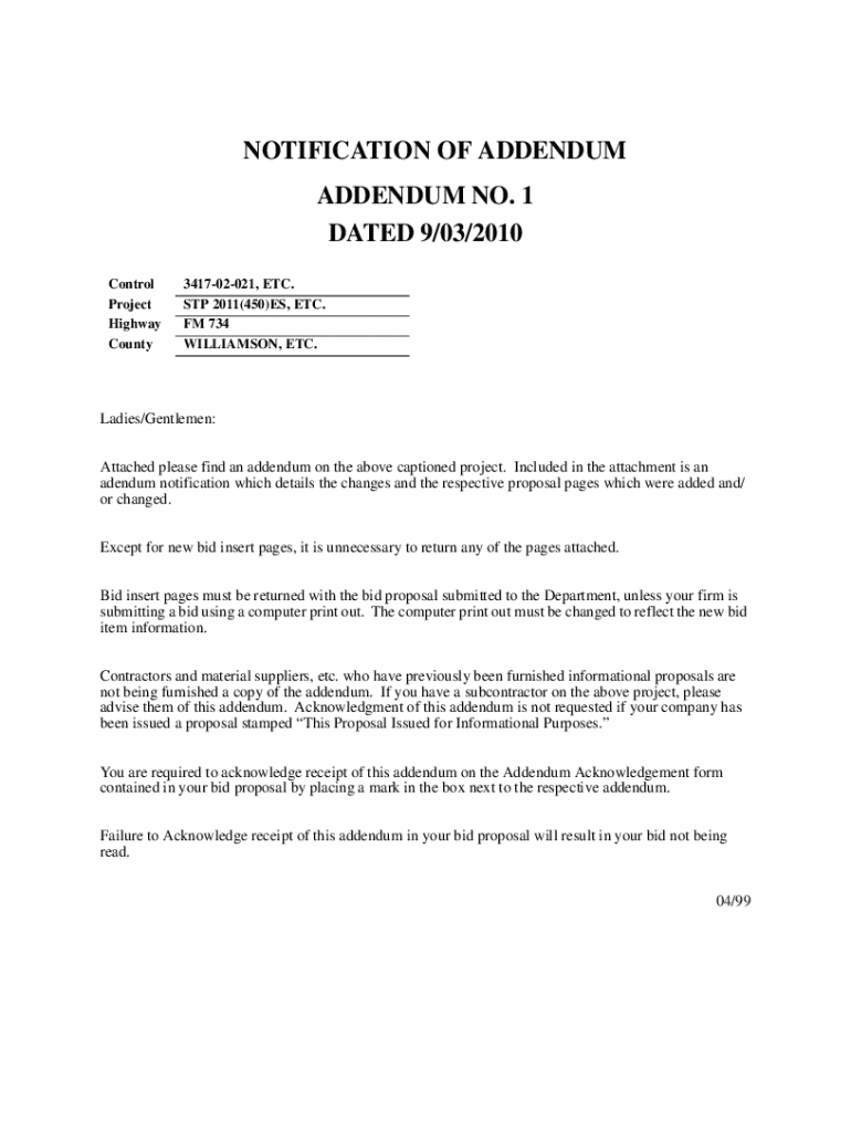 NOTIFICATION OF ADDENDUM ADDENDUM NO. 1 DATED 9/03/2010 Control Project Highway County341702021, ETC. STP 2011(450)ES, ETC. FM 734 WILLIAMSON, ETC.Ladies/Gentlemen: Attached please find an addendum