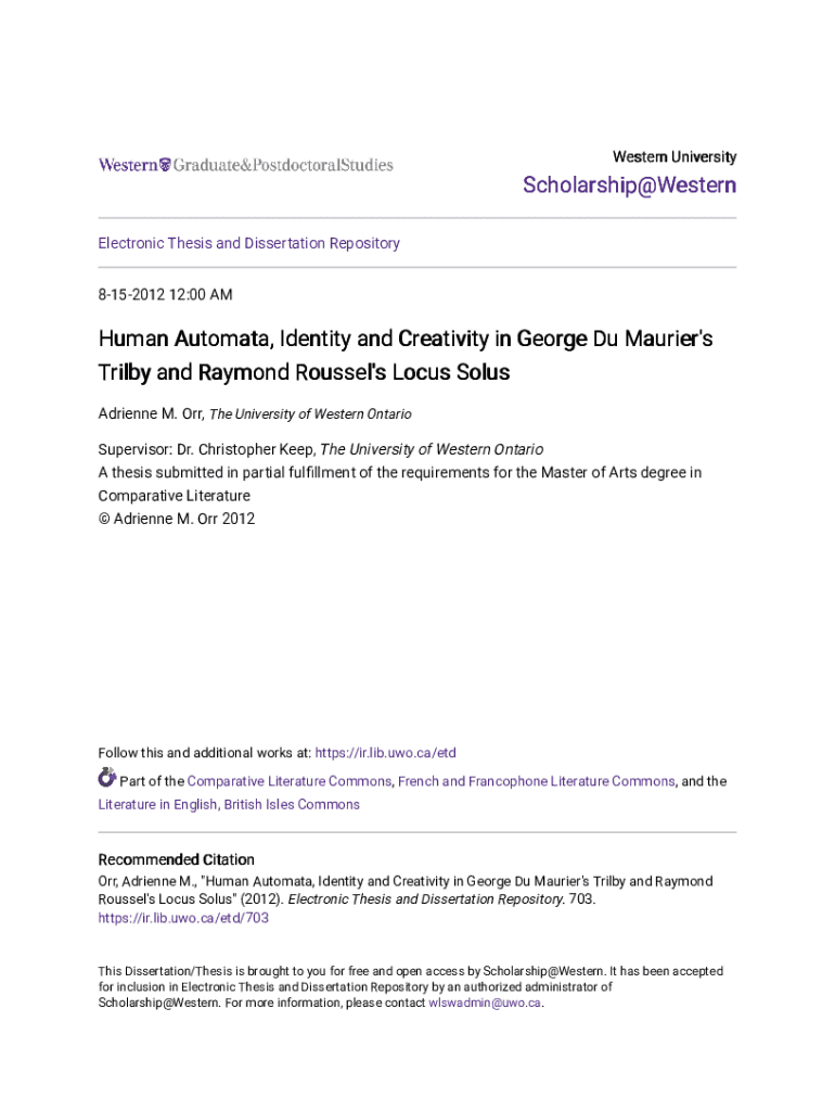 Western UniversityScholarship@Western Electronic Thesis and Dissertation Repository 8152012 12:00 AMHuman Automata, Identity and Creativity in George Du Maurier\'s Trilby and Raymond Roussel\'s Locus