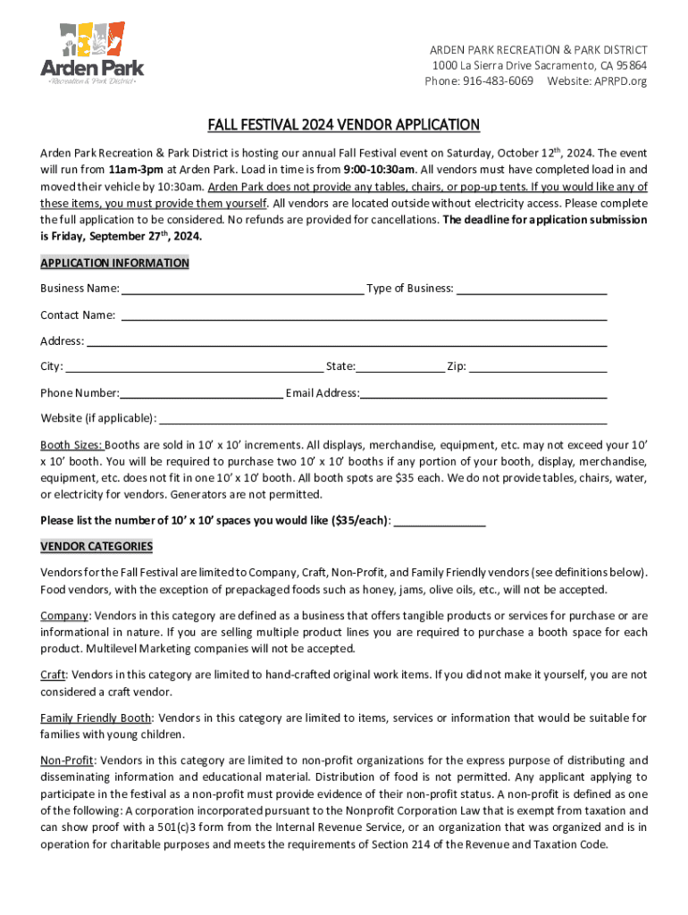 This document is an application form for vendors wishing to participate in the Arden Park Recreation & Park District\'s annual Fall Festival on October 12th, 2024, detailing requirements, booth sizes, selection criteria, and application submission procedures.