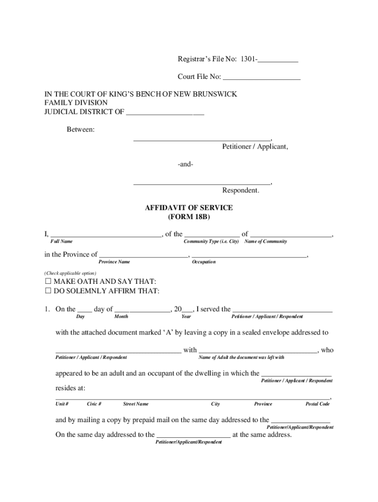 Registrars File No: 1301___ Court File No: ___ IN THE COURT OF KINGS BENCH OF NEW BRUNSWICK FAMILY DIVISION JUDICIAL DISTRICT OF ___ Between: ___, Petitioner / Applicant, and___, Respondent. AFFIDAVIT
