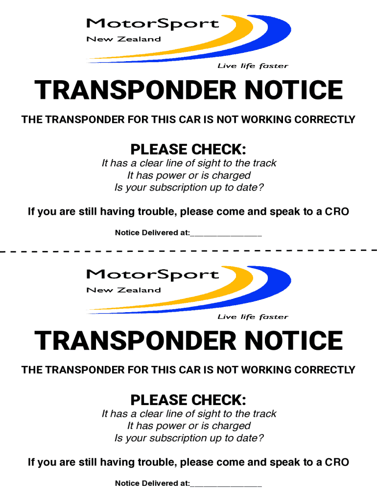 This document serves as a notice that the transponder for a specific vehicle is not functioning correctly. It provides guidelines for checking the transponder\'s functionality, including ensuring there is a clear line of sight to the track, that the transponder has power or is charged, and that the subscription is up to date. It also advises to seek assistance from a CRO if issues persist.