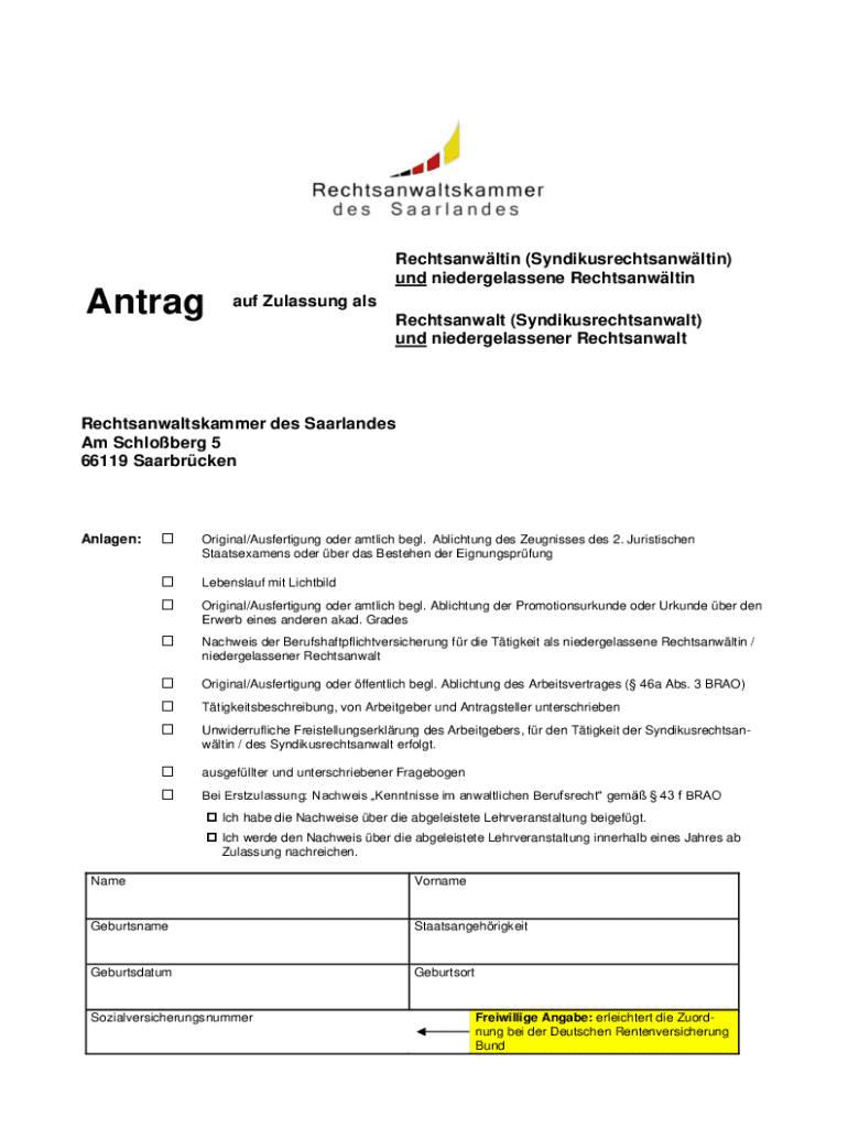 Rechtsanwltin (Syndikusrechtsanwltin) und niedergelassene RechtsanwltinAntragauf Zulassung als Rechtsanwalt (Syndikusrechtsanwalt) und niedergelassener RechtsanwaltRechtsanwaltskammer des Saarlandes