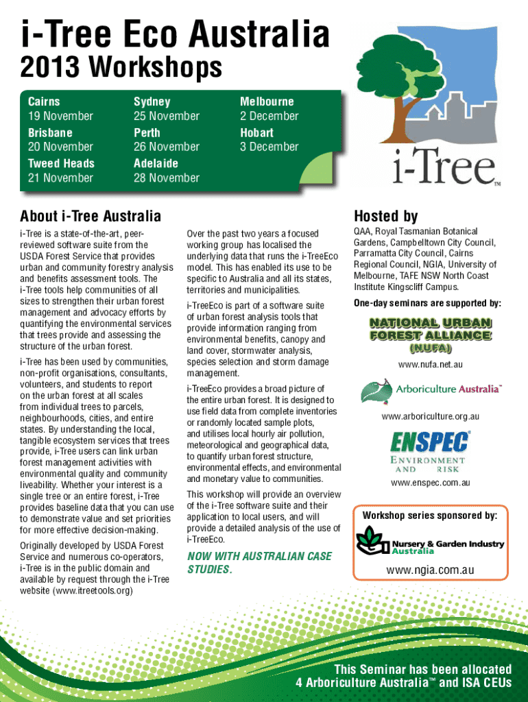 The i-Tree Eco Australia 2013 Workshops aim to provide an overview of the i-Tree software suite, focusing on its application to urban forest management in Australia. The workshops cover the i-TreeEco model, its environmental benefits, and methodologies for data collection and analysis. Participants will gain hands-on experience and understanding of how to effectively utilize i-Tree tools to assess urban forest structure and ecosystem services.