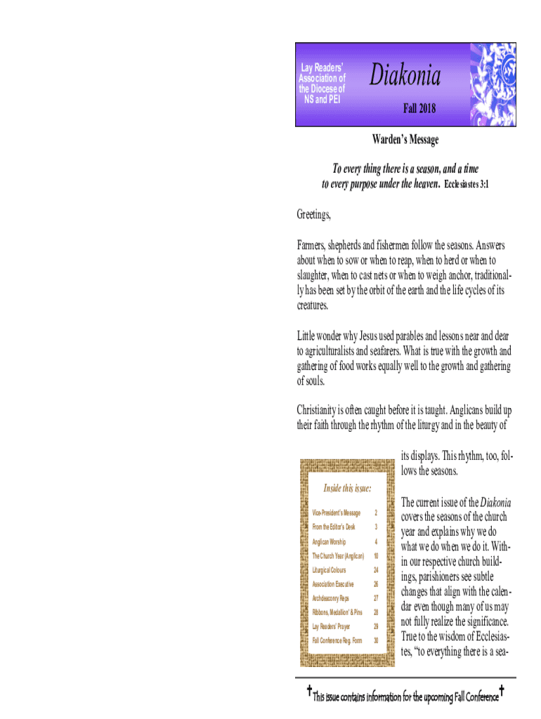 This issue of Diakonia covers various aspects of the Anglican faith, including liturgical practices, the significance of the church year, and details about upcoming events such as the Fall Conference. It features messages from church leaders and highlights the importance of understanding the rhythm and practices of worship.