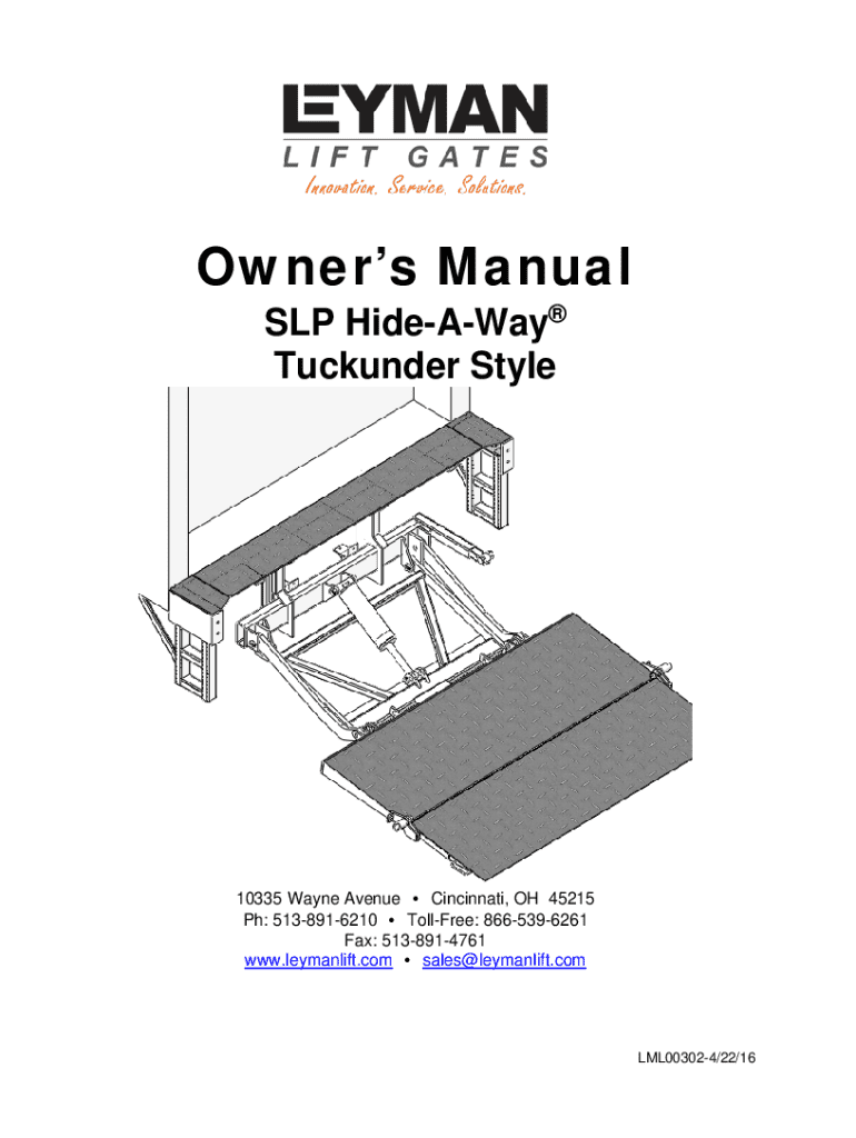 Owners Manual SLP HideAWay Tuckunder Style10335 Wayne Avenue Cincinnati, OH 45215 Ph: 5138916210 TollFree: 8665396261 Fax: 5138914761 www.leymanlift.com sales@leymanlift.comLML003024/22/16TABLE OF