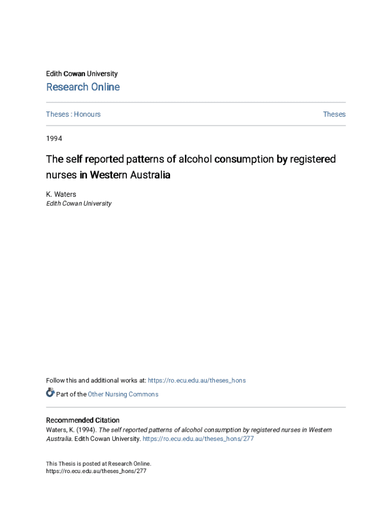 Edith Cowan UniversityResearch Online Theses : HonoursTheses1994The self reported patterns of alcohol consumption by registered nurses in Western Australia K. Waters Edith Cowan UniversityFollow this