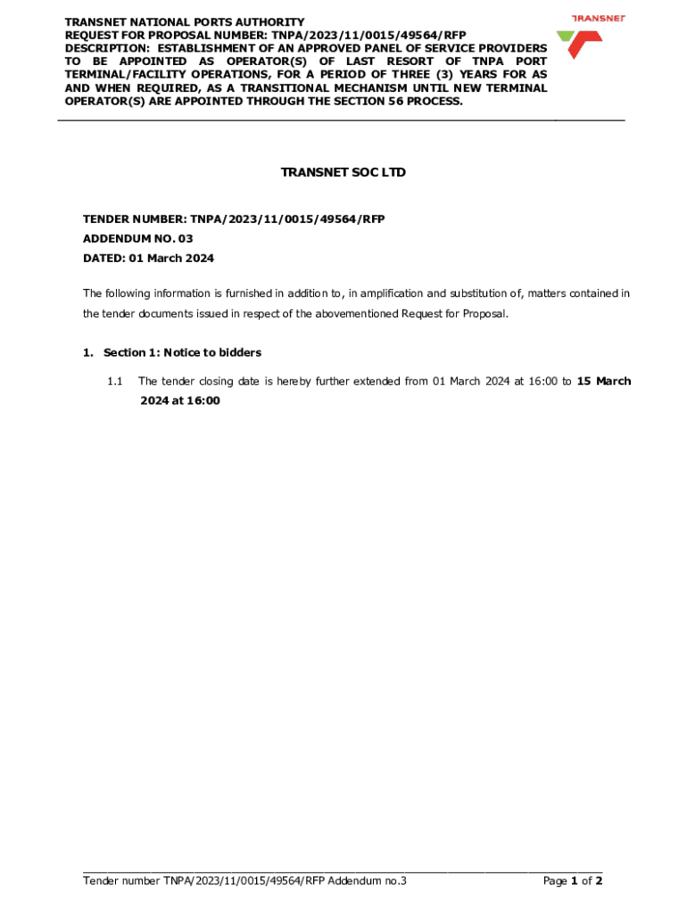 This document outlines the Request for Proposal (RFP) process initiated by Transnet National Ports Authority to establish an approved panel of service providers who will act as operators of last resort for port terminal operations. The contract will last for a period of three years as a transitional mechanism until new terminal operators are appointed. The closing date for the tender has been extended to 15 March 2024.