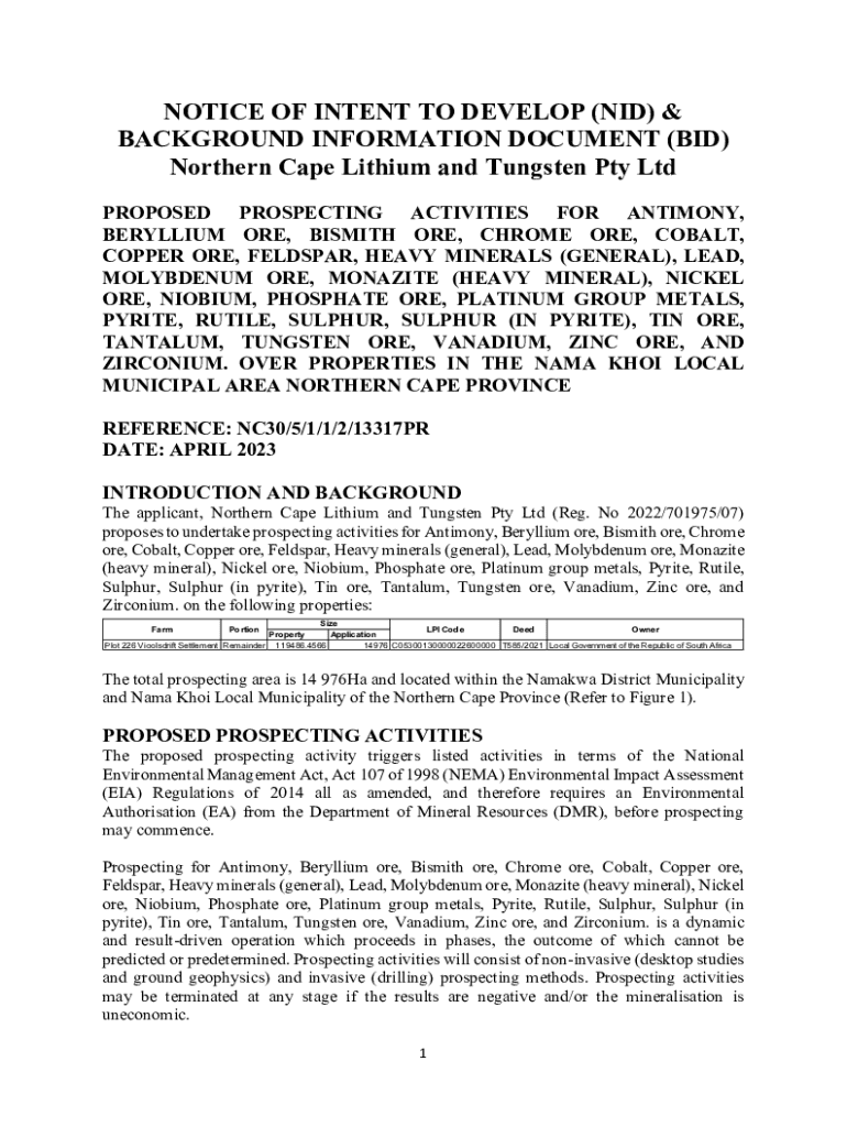 NOTICE OF INTENT TO DEVELOP (NID) & BACKGROUND INFORMATION DOCUMENT (BID) Northern Cape Lithium and Tungsten Pty Ltd PROPOSED PROSPECTING ACTIVITIES FOR ANTIMONY, BERYLLIUM ORE, BISMITH ORE, CHROME