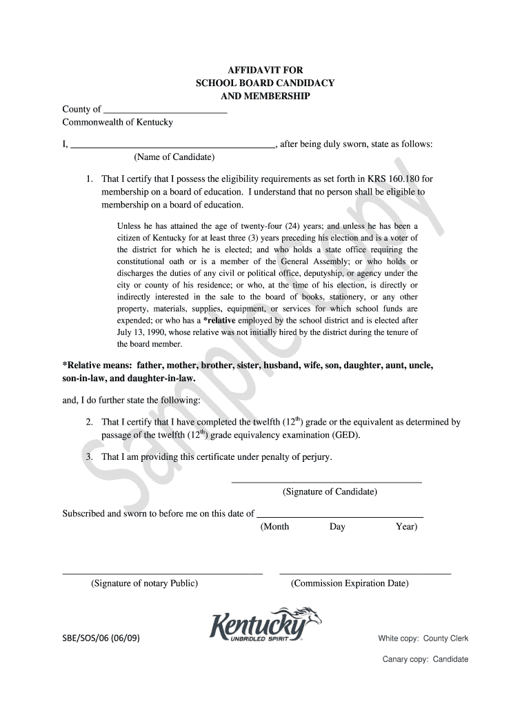 AFFIDAVIT FOR SCHOOL BOARD CANDIDACY AND MEMBERSHIP County of Commonwealth of Kentucky I, after being duly sworn, state as follows: (Name of Candidate) 1. That I certify that I possess the eligibility