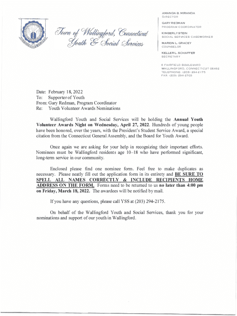 This document outlines the nomination process for the Annual Youth Volunteer Awards Night hosted by Wallingford Youth and Social Services. It provides guidelines for nominating Wallingford residents aged 10-18 who have demonstrated significant community service, and includes details on the award criteria and submission deadlines.