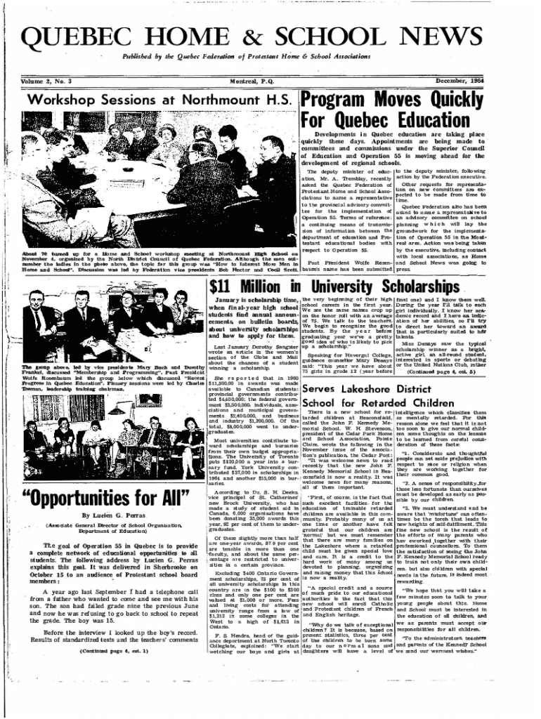 QUEBEC HOME & SCHOOL NEWS P11blished by the Quebec Federolion of Protest11111 Home & School AssociolionsDecember, 1964lontreal, P.Q.Volume 2, No. 3Workshop Sessions at Northmount H.S.i,,,:.,Program