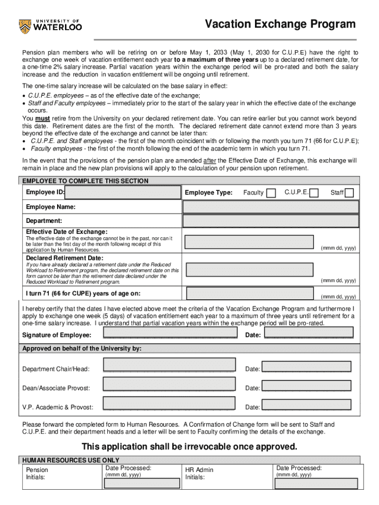 Vacation Exchange Program Pension plan members who will be retiring on or before May 1, 2033 (May 1, 2030 for C.U.P.E) have the right to exchange one week of vacation entitlement each year to a maximum