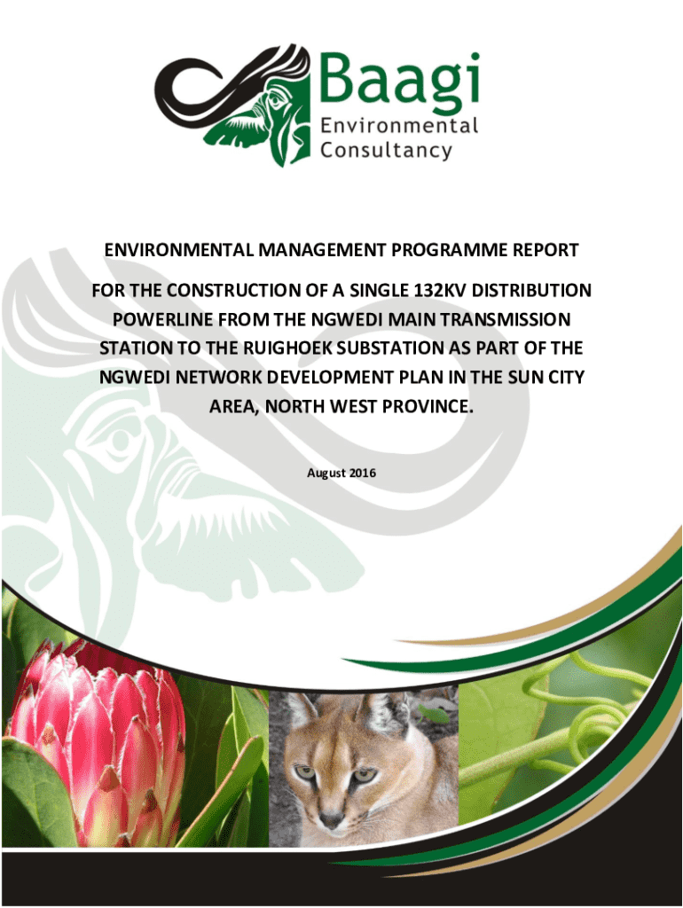 This document outlines the Environmental Management Programme (EMPr) for the construction of a 132kV power line from the Ngwedi Main Transmission Station to the Ruighoek Substation in the Sun City area, aimed at minimizing environmental impacts during construction and operation phases.