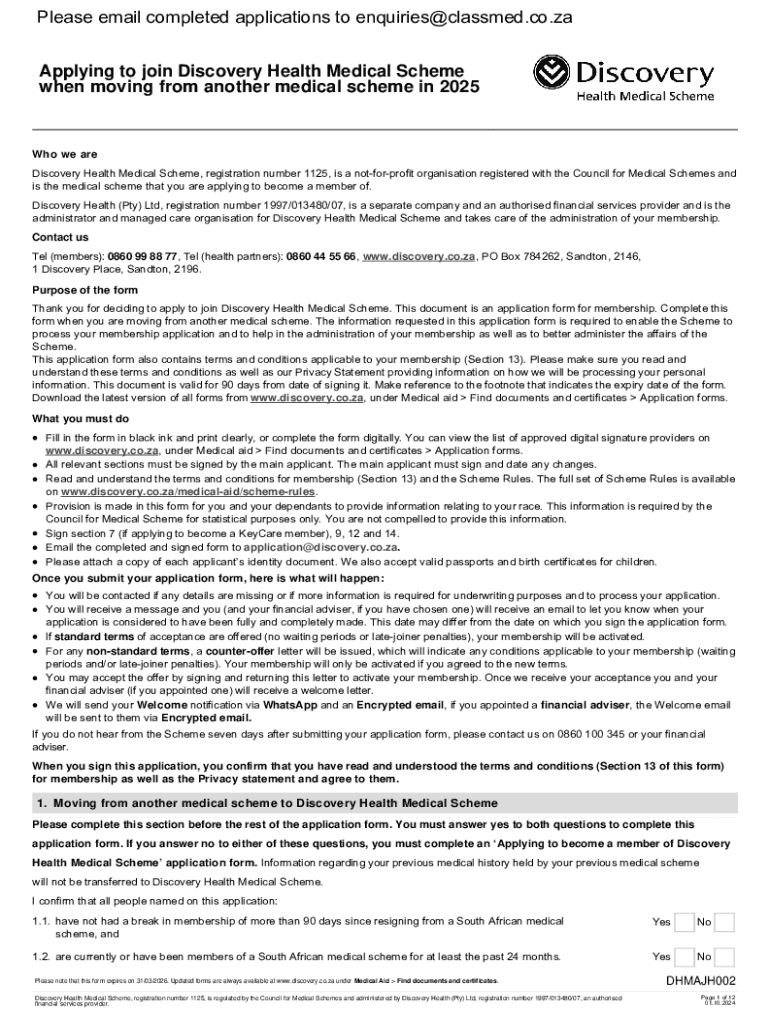 Please email completed applications to enquiries@classmed.co.za Applying to join Discovery Health Medical Scheme when moving from another medical scheme in 2025Who we are Discovery Health Medical