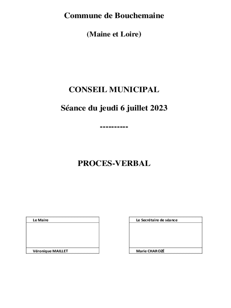 Commune de Bouchemaine (Maine et Loire)CONSEIL MUNICIPAL Sance du jeudi 6 juillet 2023 PROCESVERBALLe MaireLe Secrtaire de sanceVronique MAILLETMarie CHAROZRpublique Franaise Dpartement de Maine et