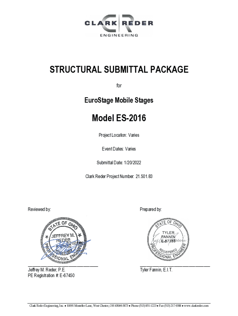 STRUCTURAL SUBMITTAL PACKAGE forEuroStage Mobile StagesModel ES2016 Project Location: Varies Event Dates: Varies Submittal Date: 1/20/2022 Clark Reder Project Number: 21.501.83Reviewed by:Prepared