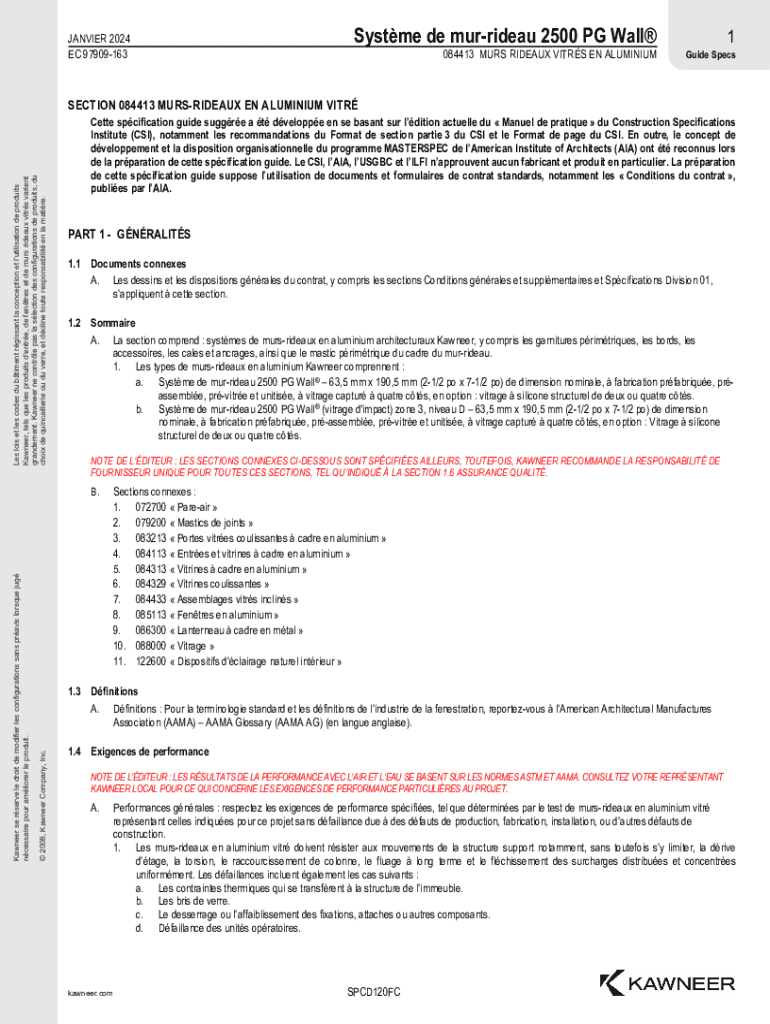 JANVIER 2024 EC 97909163Systme de murrideau 2500 PG Wall 084413 MURS RIDEAUX VITRS EN ALUMINIUM1 Guide SpecsLes lois et les codes du btiment rgissant la conception et l\'utilisation de produits Kawneer,