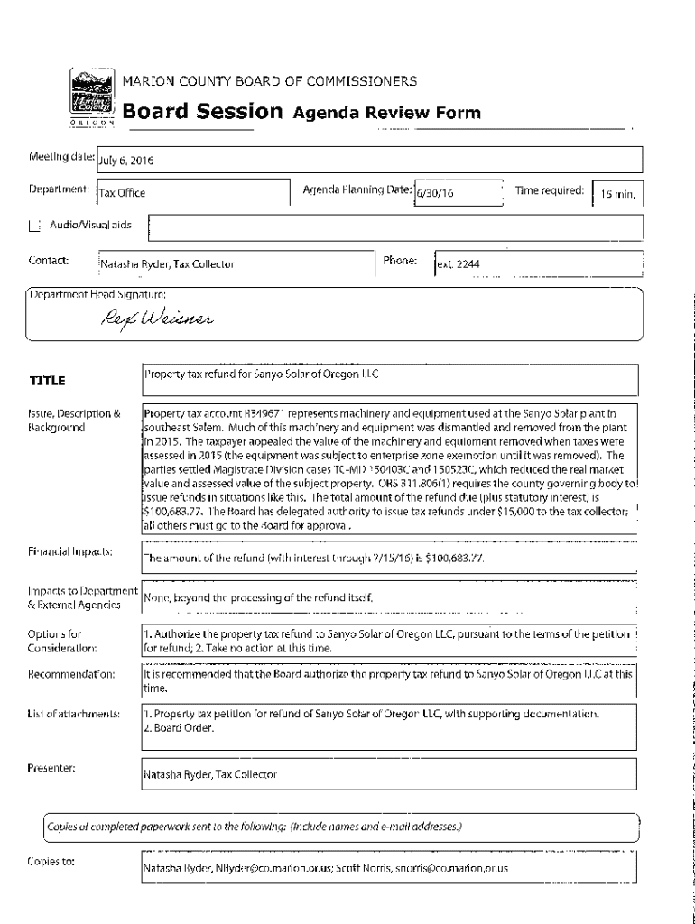 This document is an agenda review form for the Marion County Board of Commissioners regarding a property tax refund petition from Sanyo Solar of Oregon LLC. It outlines the circumstances surrounding the appeal and subsequent refund due to the taxpayer, including the financial implications and recommended actions for the board.