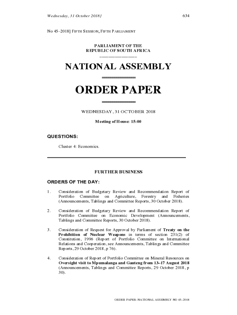 Wednesday, 31 October 2018]634No 452018] FIFTH SESSION, FIFTH PARLIAMENTPARLIAMENT OF THE REPUBLIC OF SOUTH AFRICA ___NATIONAL ASSEMBLY ORDER PAPER WEDNESDAY, 31 OCTOBER 2018 Meeting of House: 15:00